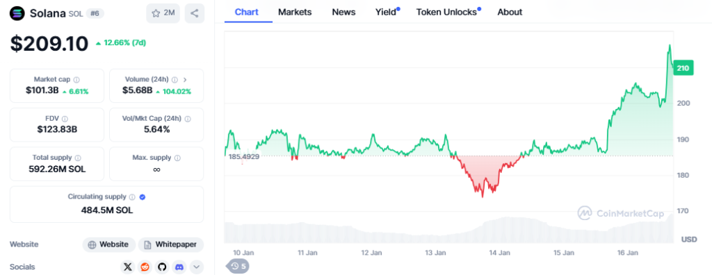 The significant drop in Solana’s price on January 13th, which exceeded 11%, occurred in tandem with Bitcoin’s market fluctuations. SOL broke through its key support level at $185, briefly trading below $170 on major exchanges. However, the altcoin has bounced back strongly, currently trading near $215—a more than 15% increase in the past 24 hours, marking a 27% rise from its weekly low.