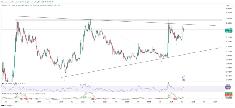 Since 2020, XLM has consistently formed higher lows, resisting the broader crypto market’s pullbacks. Although it failed to set a new all-time high in 2021, Stellar’s price has been consolidating inside a long-term symmetrical triangle. The current price action brings it close to the triangle’s resistance, marking the fourth breakout attempt — historically a crucial turning point.