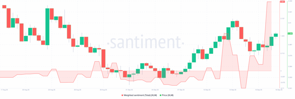 Sentiment indicators reinforce the technical outlook. Stellar’s Weighted Sentiment has climbed to 2.82, reflecting growing optimism across social channels. Positive crowd psychology often translates into reduced selling pressure and increased accumulation, as sidelined investors may enter the market. Combined with technical support and MACD signals, this optimism strengthens the case for an upward move.