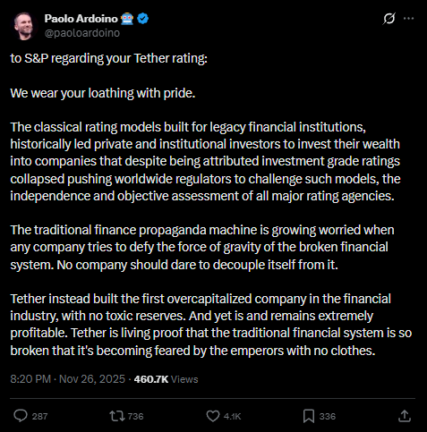 — Paolo Ardoino 🤖 (@paoloardoino) November 26, 2025