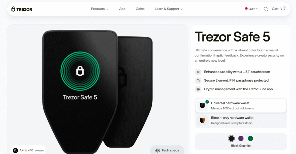 Trezor’s Safe 5 is another top-tier cold wallet with EAL6+ security, open-source firmware, and Shamir Backup support. Its 1.54-inch touchscreen and haptic feedback make it easy to use, even for beginners.