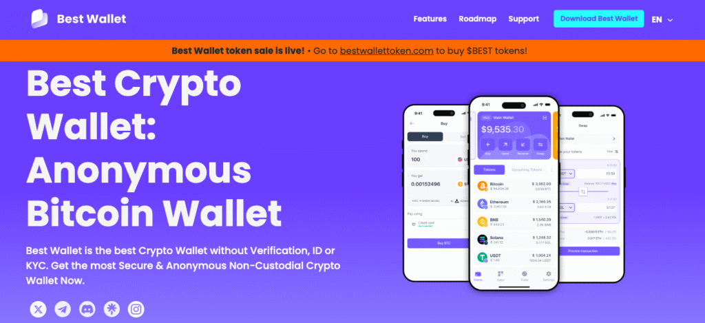 Best Wallet tops our list for good reason: it’s non-custodial, requires no KYC, and offers full self-custody with built-in DeFi tools. Designed with multi-chain support, it integrates seamlessly with the Polygon network while also allowing you to swap tokens, access early-stage crypto presales, and manage your entire portfolio—all from your phone.