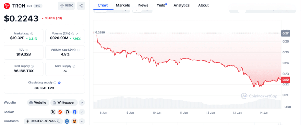 Amid heightened volatility in the cryptocurrency market, Tron (TRX) is facing mounting bearish pressure. Currently holding the 10th rank with a market capitalization of $19.25 billion, TRX’s price trend is showing signs of a potential decline. Over the past week, the coin has experienced six consecutive bearish candles, with a brief recovery on January 10. This has led to a 16% drop in TRX’s value, from $0.2688 to its current support level of $0.2231.