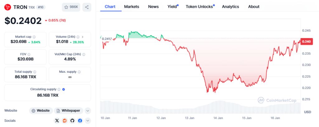 Crypto analyst Rose Premium Signal highlights the formation of a falling wedge pattern in TRX’s price chart, signaling a bullish breakout. Key support levels are identified at $0.2244, with projections of reaching $0.3957, $0.4675, and ultimately $0.5486. If the bullish trajectory holds, this could represent a 128% price surge from current levels.