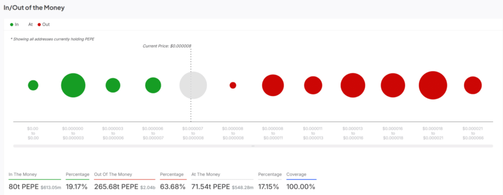 On-chain data indicates that over 63% of PEPE holders are currently at a loss, while only 19.17% are in profit. Meanwhile, 17.15% of addresses hold PEPE at breakeven levels. This distribution suggests that a bullish push could trigger significant selling pressure from investors looking to recover losses. However, if whale accumulation continues and demand strengthens, this selling pressure could paradoxically fuel a price rally.