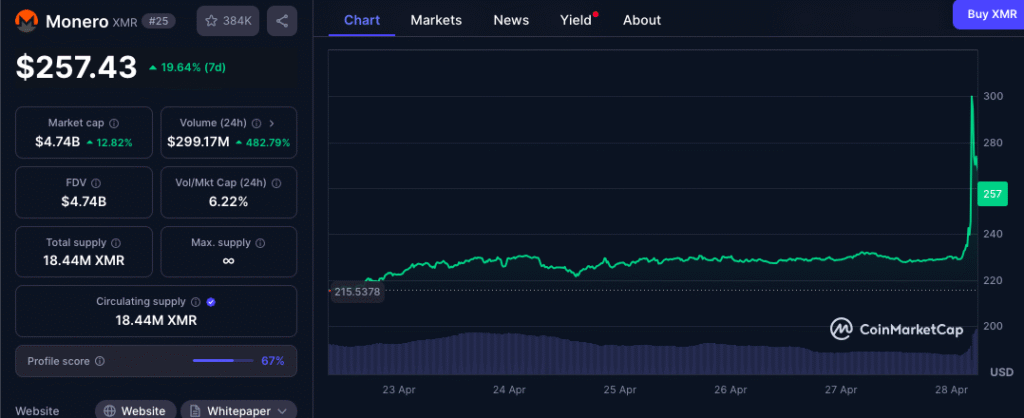 Data from CoinMarketCap reveals that the XMR price reached a daily high of $339 before settling at around $280 at the time of writing. This price surge was accompanied by an extraordinary 380% increase in Monero’s trading volume, reaching a substantial $304 million within the same 24-hour period. This unusual trading activity has left many investors questioning the underlying reasons for such a rapid appreciation.