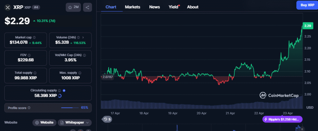 For XRP to confirm a bullish breakout, it would need to decisively surpass the recent high of $2.25 recorded on April 13th. Successfully breaching this resistance level could pave the way for a potential ascent towards $3.30, with further targets in the $5.00 to $5.65 range contingent on overall market momentum. At the time of reporting, XRP has gained over 7% and is trading at the $2.25 mark.