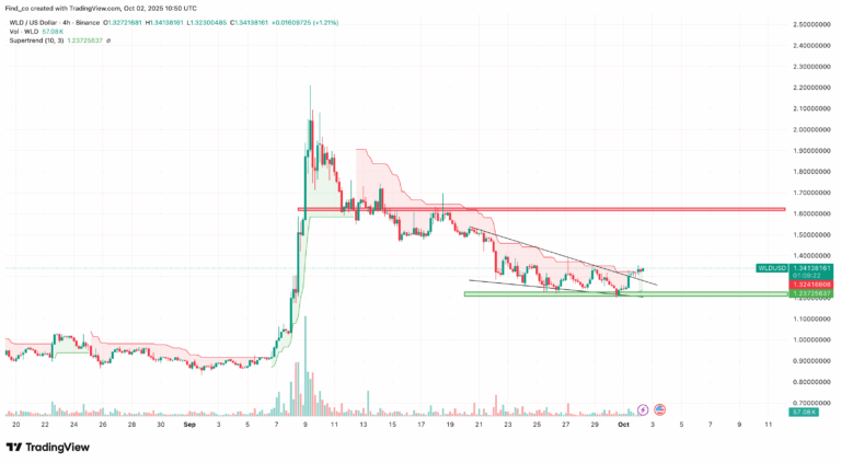 After a sharp dip in late September, Worldcoin (WLD) appears to be regaining momentum. At the time of writing, WLD trades at $1.32, signaling a potential end to its short-term decline. The altcoin recently broke above the descending channel that had contained its price for the past ten days, suggesting that sellers are losing control. Technical indicators reinforce this optimism: the Supertrend signal has flipped bullish, placing its green line below the current price and offering a strong buy signal.