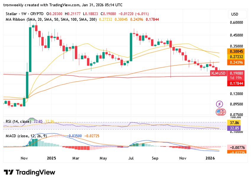 Despite the rebound, Stellar’s higher-timeframe indicators remain mixed. The weekly RSI sits near 32.8, below its signal line, pointing to weak momentum and mild oversold conditions rather than a confirmed reversal.