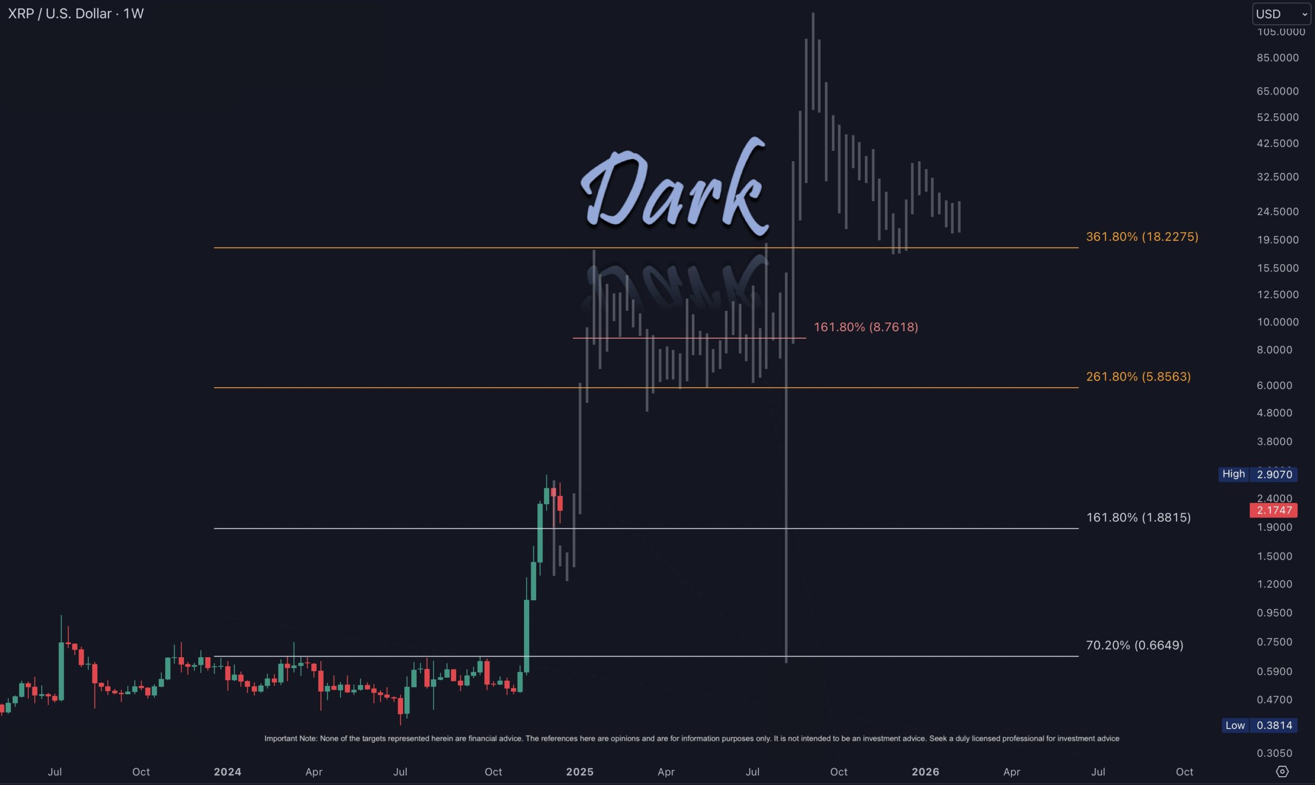 The analysis revolves around significant Fibonacci levels, including 161.80% at $8.76, 261.80% at $5.85, and 361.80% at $18.22. These levels, according to Dark Defender, align with XRP’s historical price behavior, suggesting the possibility of a substantial upward move.