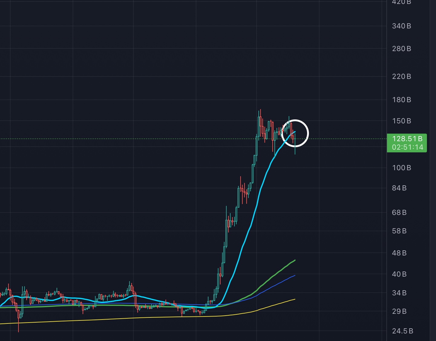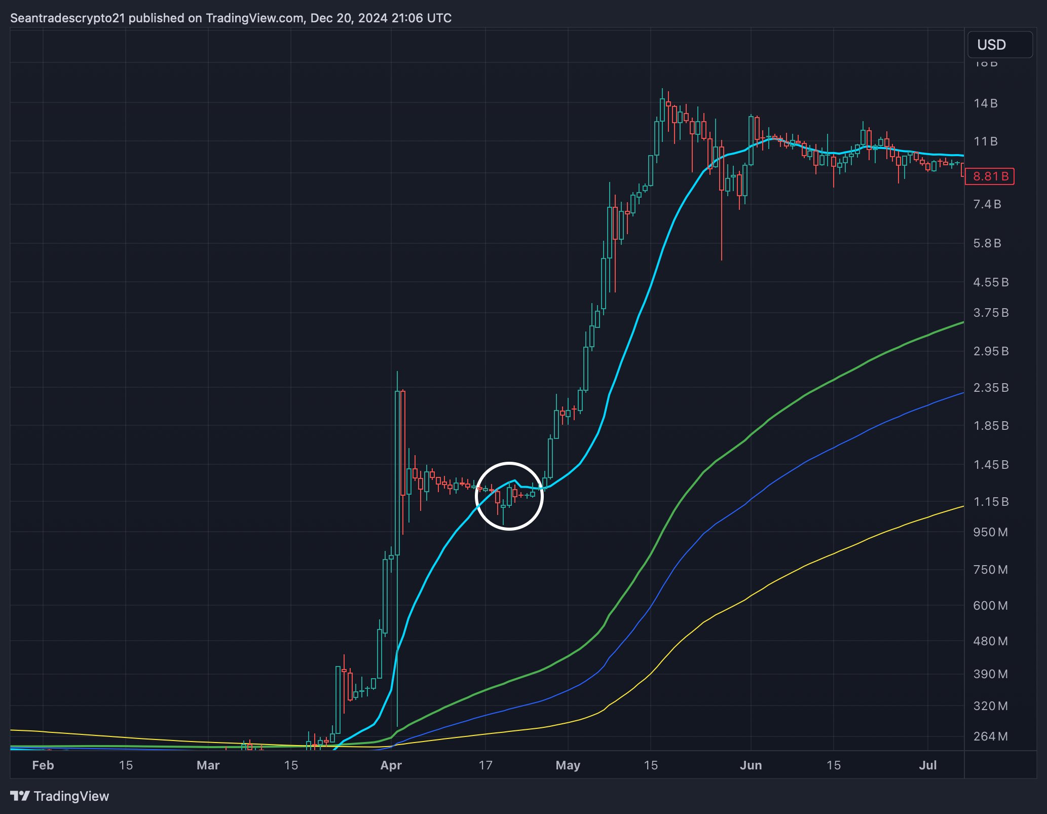The first chart shared by Crypto V highlights XRP’s price movement in 2017. A key observation is the 20-day simple moving average (SMA), which briefly crossed above XRP’s price during its rise. This crossover triggered a massive rally that culminated in XRP reaching its all-time high. Crypto V notes that the same pattern appears to be repeating in 2024, where XRP is once again consolidating near the 20-day SMA after a notable upward movement in recent weeks.