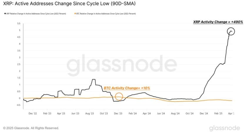 According to a recent Glassnode analysis shared by AMBCrypto, XRP’s active addresses have skyrocketed by 490% since its cycle low in 2022. In contrast, Bitcoin’s active addresses have grown just 10% during the same period. This dramatic divergence points to a fundamental shift in market sentiment—and strategy.