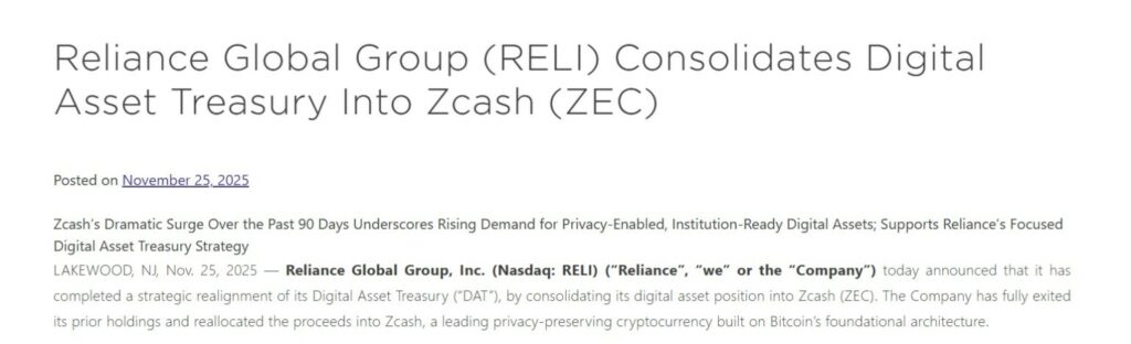 - Reliance Global Group’s full investment in Zcash highlights confidence in its long-term value.
