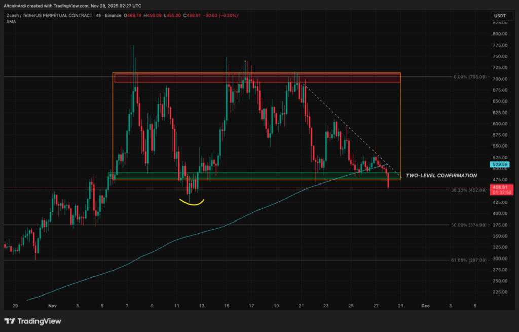 Despite the ongoing recovery of the broader cryptocurrency market, privacy coin ZCash (ZEC) has been struggling to maintain its momentum. After a steep 30% decline over the past week, ZEC is now trading at a significant loss, with prices dropping below the crucial $480 support level. This marks a critical juncture for the privacy-focused cryptocurrency, leaving traders and analysts watching closely for signs of further weakness or a potential recovery.
